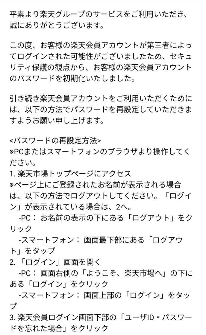 そしたら楽天市場からメールが届いてよく見ると不正ログインされた可能性があるのでパスワードを初期化したとの事。