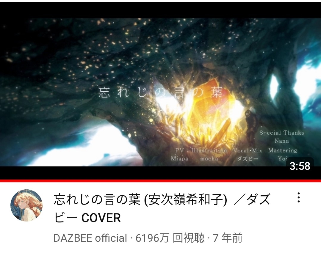 ★YouTubeで「忘れじの言の葉 ダズビー」と検索してみてください。上から1~5番目くらいに、3分58秒の下記動画が出てくると思います。