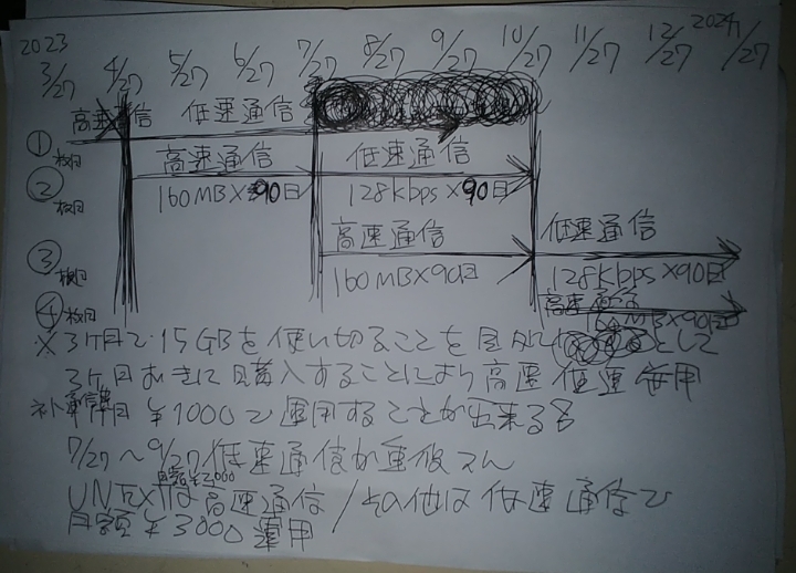 あの、現在(※ 4月13日時点)、3月27日に購入した国内産の格安SIMの高速通信を使いきってしまっている状態なんですが、それの低速通信が9月27日まで使える。仮に、4月27日に、新たにおんなじ格安SIMを購入すると、それの期限が10月27日で、3ヶ月で、容量;15ギガバイト、一日;160メガバイトを目処にして使い切り、そして、残りの期間を低速通信で乗り切る。と、同時に、二枚目の高速通信の終了時、購入してからその3ヶ月が経った時点で三枚目を購入、すぐさま高速通信を開始して、そして、三枚目の高速通信が終了するタイミング(同じように3ヶ月後を目処)で、四枚目…、というような感じで数珠つなぎ的に次々と(若しくは、続々と)購入してゆけば、高速通信と低速通信の両刀使いをキープしながら、通信費、月額;¥1000に抑えて運用、尚且つ、UNEXTも観ることが出来、UNEXTの月額;¥2000をプラスすると¥3000ぐらいにはなりますが。これで、なんとかなりそうだな?というような境地というか心持ちに達しました。また、そうすると、一枚目と二枚目の低速通信の期間が多少重複してしまいますが、これは仕方ありません。