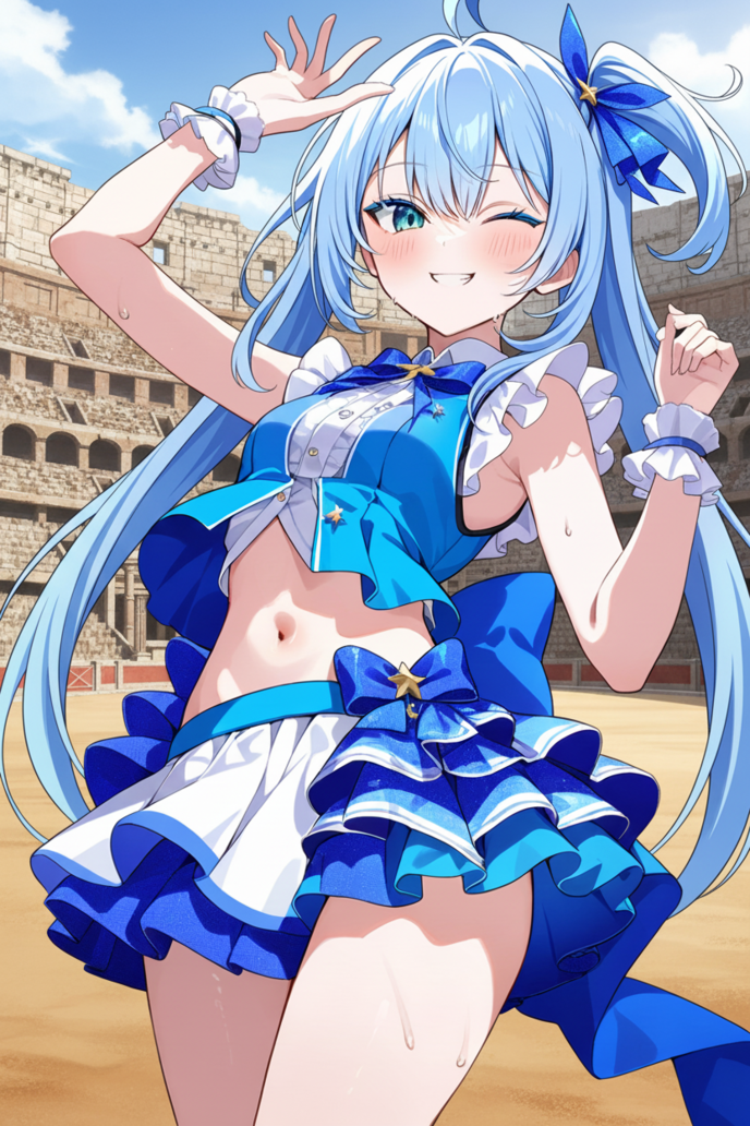 向こう側の通路から飛びこんでくるように登場する水色の長いツインテールの小柄な女の子。その服装はミニのプリーツスカートにハイソックスで絶対領域、胸に大きなリボンをあしらった”ニチ朝”幼女向けのアニメで見れそうなフリフリのへそ出し衣装。この都市に居るってことは狭間世界に来て結構年数経ってると思うんだけど恥ずかしくないのかな?年齢的に。