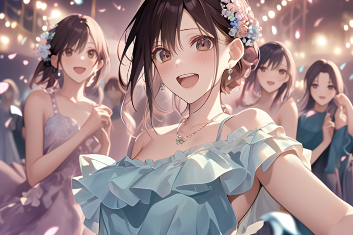 すると、スポットライトが一箇所に当たり、そこには花のティアラと水色のパステルカラーのドレスに身を包んだ桜井美柑と、高校時代の同級生たちの姿が浮かび上がった!