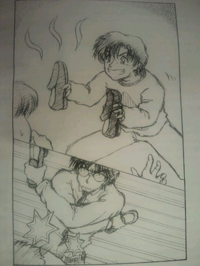 二連発の物凄い音がして、悪の怪人の動きが止まった。見ると、桃山先生のシューズは背後から現れた合紅先生の手に渡り、交差しながら先輩の後頭部を駆け抜けて行ったところだった。匂いと痛みのダブルパンチ。お見事な二刀流。