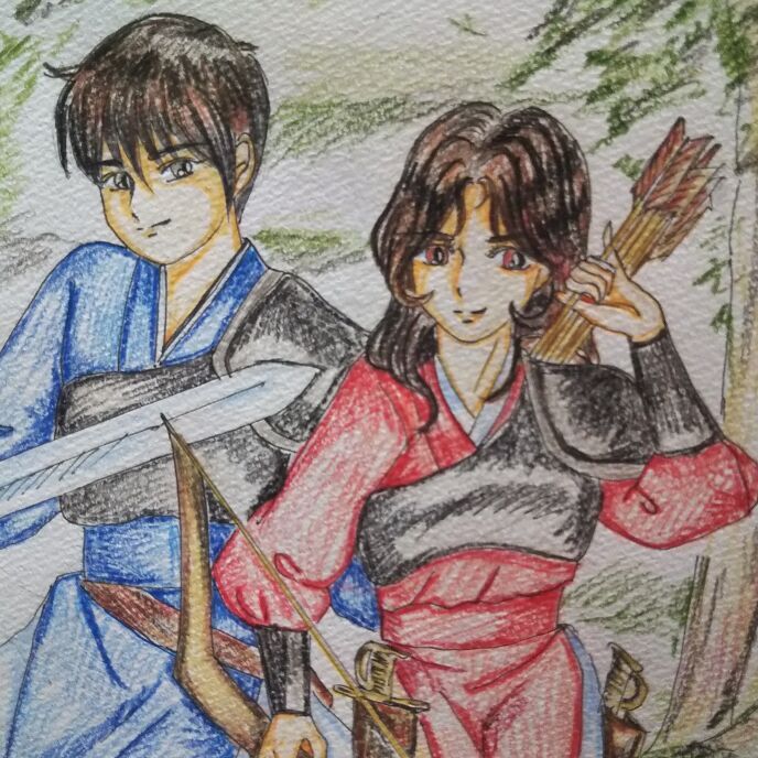 洞窟の入り口からノアーサが弓を放つ。三人は射止めた。弓を構えたまま、カノイとノアーサは外へとゆっくり出る。右側から、狙われそうになるのを、カノイが剣で仕留める。