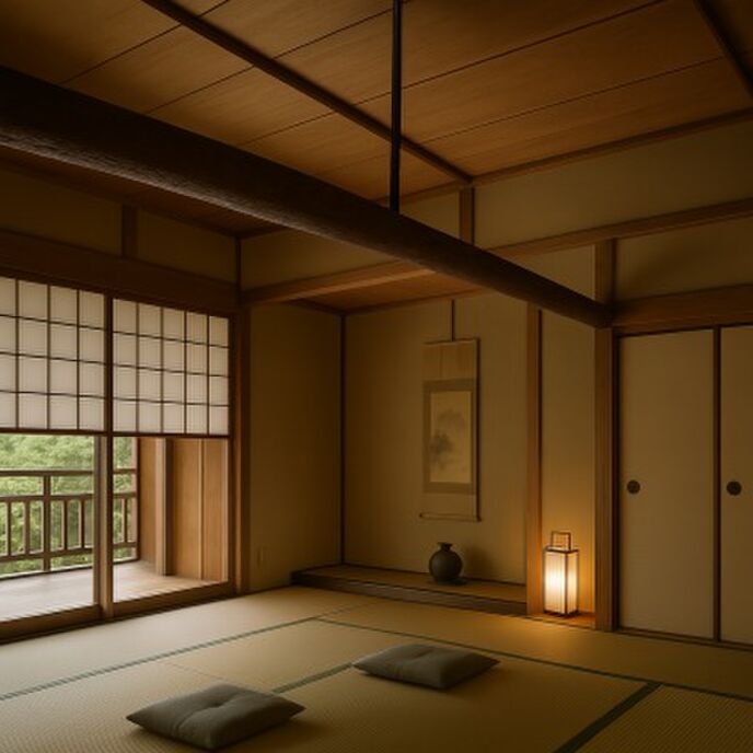小さな椅子とテーブルが置かれ、その奥のガラス窓の向こうには、手入れの行き届いた日本庭園が広がっている。