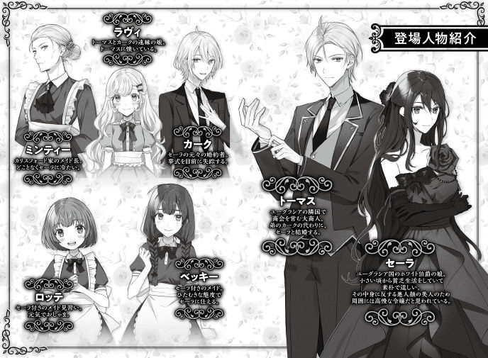 セーラが住むこの世界は、どの国も王制で、厳格な身分制度がある。セーラの生家であるホワイト家はホワイト領を統治する貴族ではあるのだが、とある事情から困窮していた。そこで、隣国に住む金持ち商人の弟であるカーク・カリスフォードと結婚し、実家を救ってもらおうという算段なのだ。