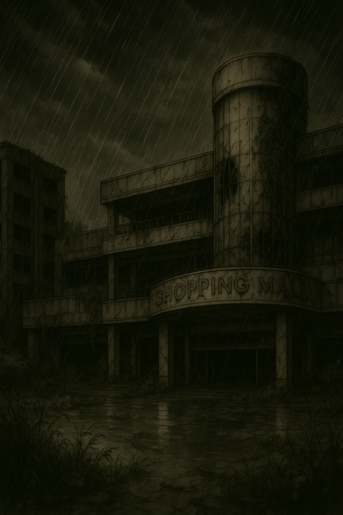 苛立ちを隠せない合成音声が漏れる。K-03は、正面玄関のガラスがすべて抜け落ちた建物の残骸に足を踏み入れた。かろうじて読める『SHOPPING MALL』の褪せた文字が、雨に濡れている。
