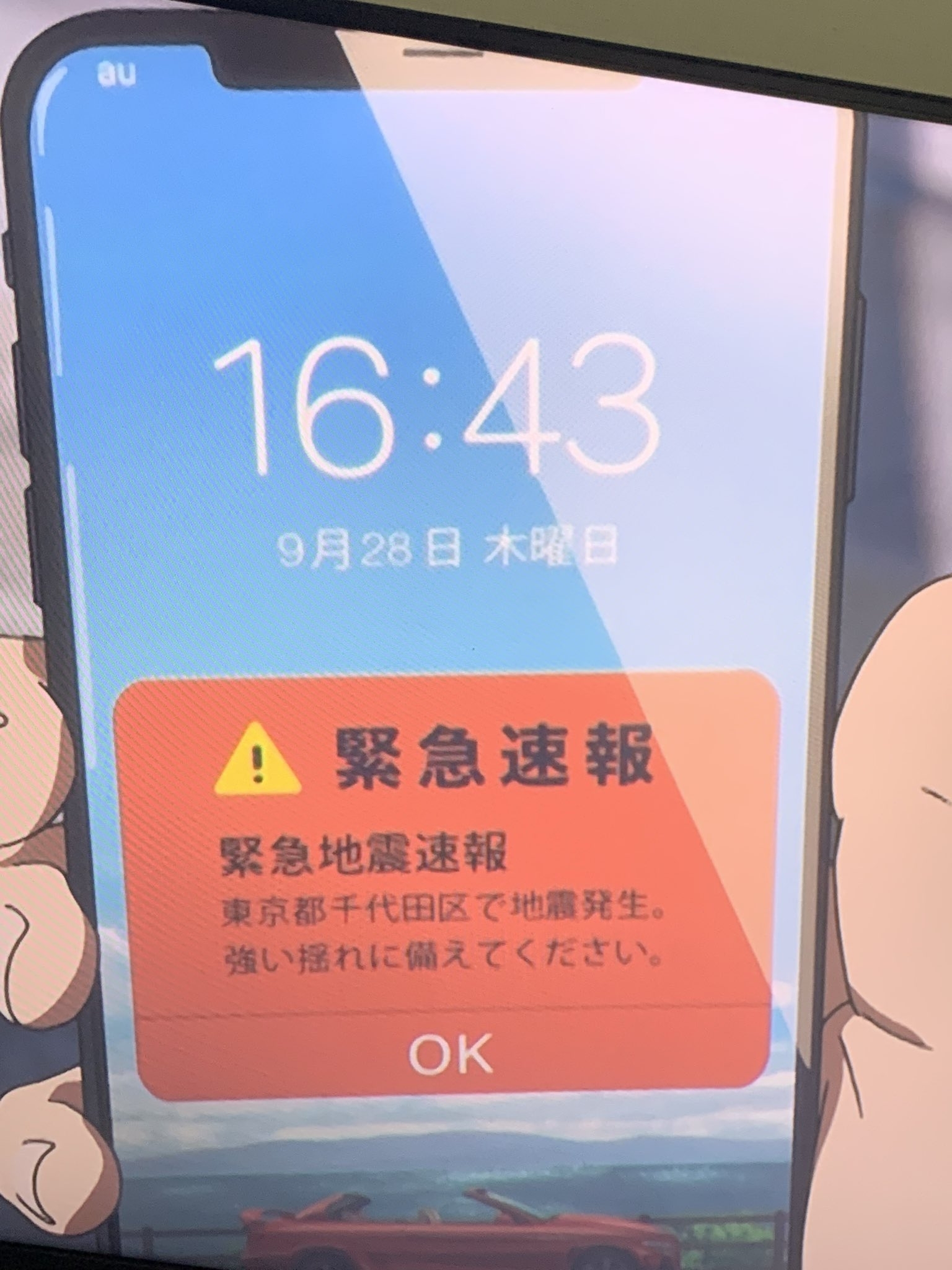 更に、その後のシーンで「16:43 緊急地震速報」の画面が出てきます。
