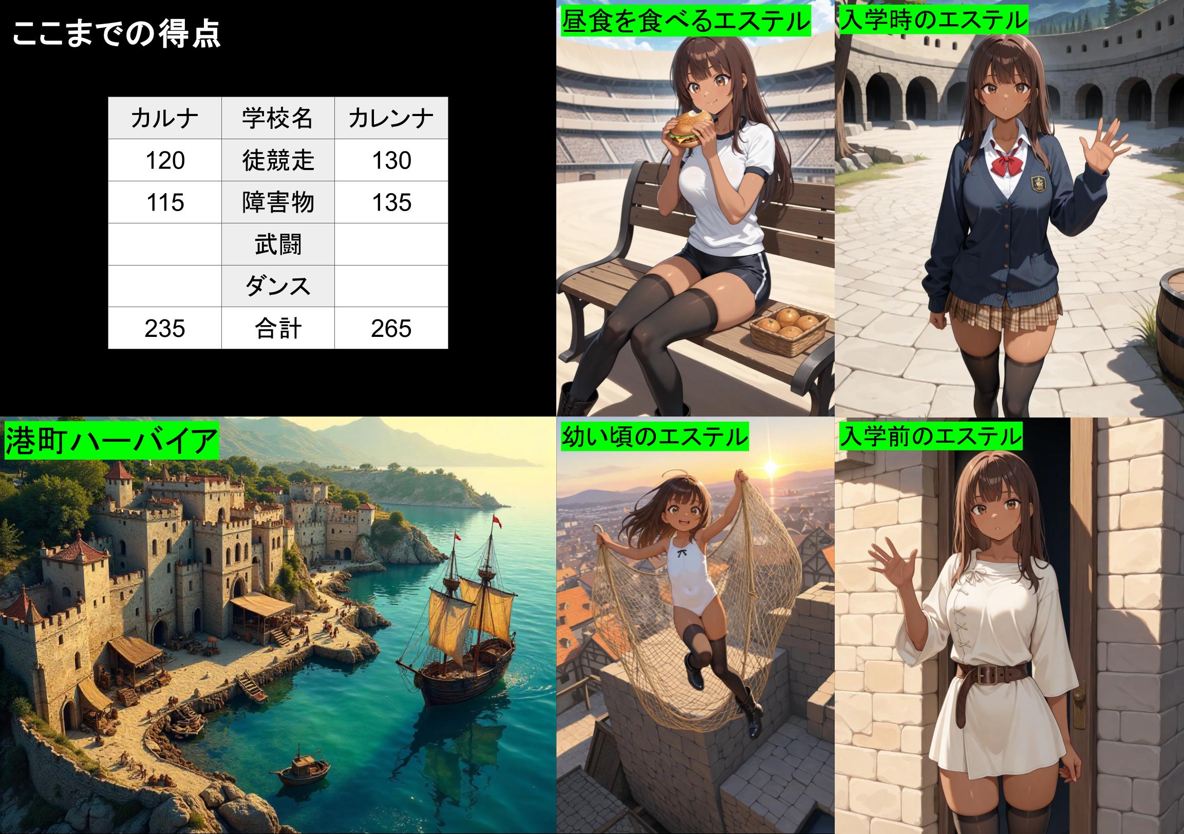 午前中の競技が終わった。ここまでの得点はカルナが235点、カレンナが265点。カレンナが30点リードしている。