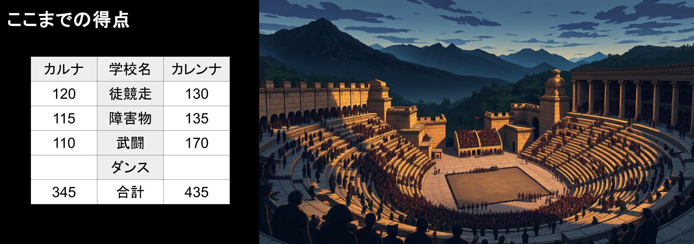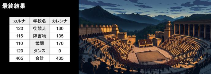 結果として、今年もカレンナは合計得点において、カルナに勝つことはできなかった。