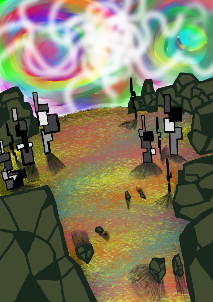 空は極彩色、水の上に垂らした色とりどりの絵の具をかき混ぜたようなマーブル模様。勿論ぐるぐると動いていて、目が回りそうだ。