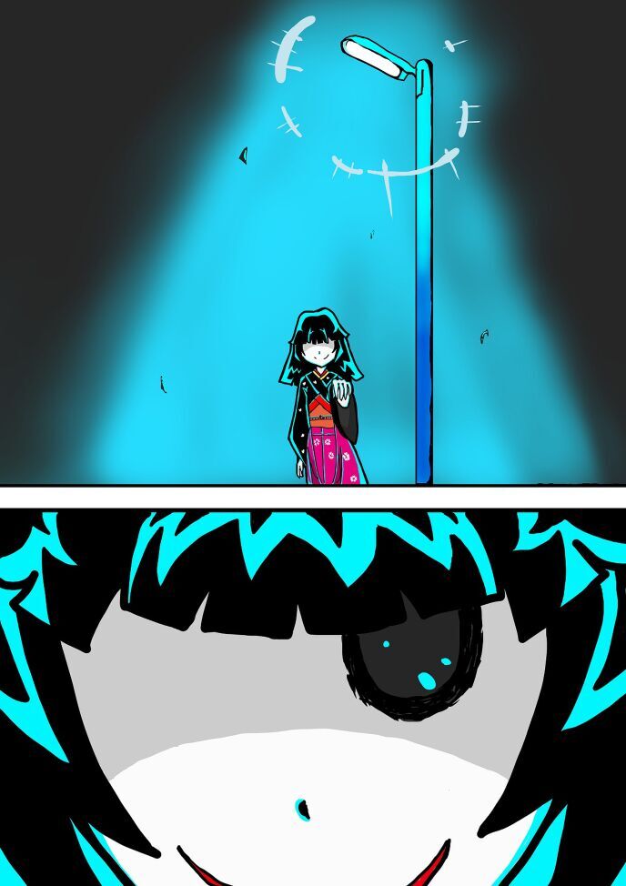 オレは念力で引っ張られているような感覚で、人形娘の霊のいる街灯まで歩いていく。すると人形娘の霊は少しずつ遠くなっていく。後ろ向きで、スライドしていくように。