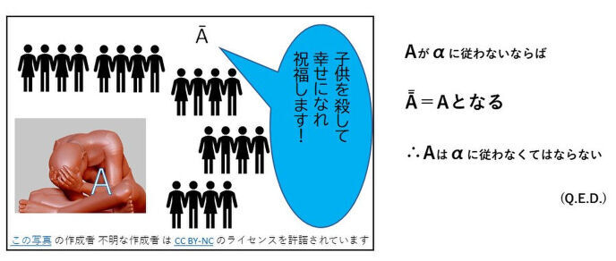 だが、新婚の頃、子供なんかいらないと家人にさんざん言われ無視され続けたくるみあるくには「子供を殺して幸せになりなさい、祝福します!」というふうに聞こえた(語句の指し示す対象が「くるみあるく」と「彼ら」で差がある)。