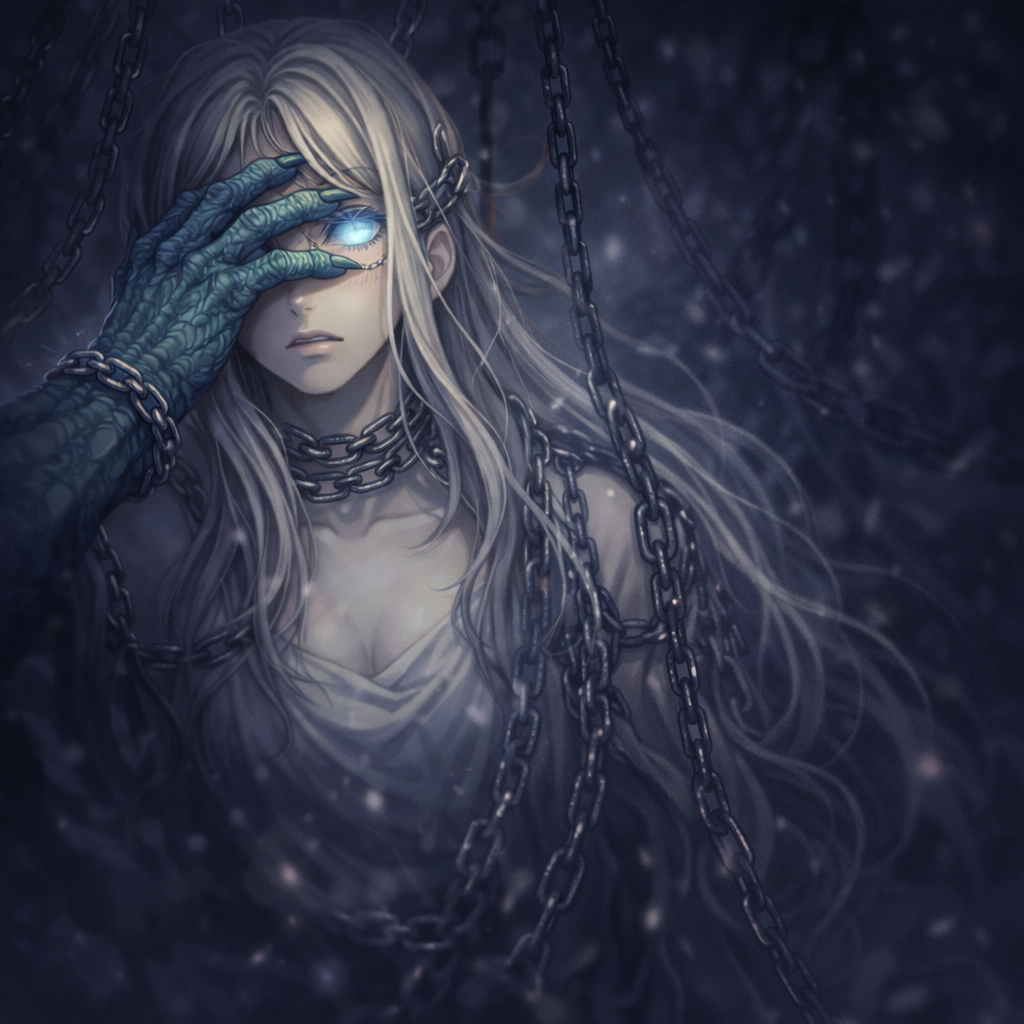 女神様を鎖で縛って、目を腕で隠してる!」