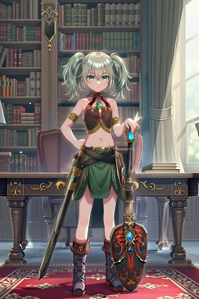 服装は実用的な作業着と皮鎧を合わせてアレンジしたようなデザインで、腰には鞘に納められた長剣と小さな道具袋が提げられ、道具袋からは庭いじりに使うと思しきハサミなどが覗いている。
