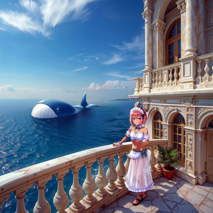 テラスから身を乗り出すと、海の沖に巨大なクジラのモンスターが姿を現していた。その巨体は、小さな島と見紛うほどだった。
