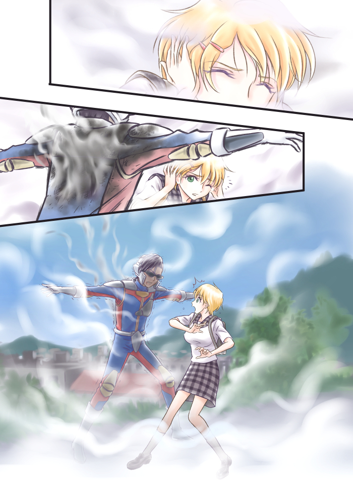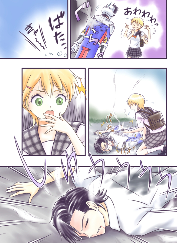 変身ヒーローさんが苦しみだし、体のあちこちから火花みたいな光がバチバチし始めて、触るに触れない状態に、私がオロオロと困っていると、そのスーツやヘルメットが消滅して私にでもわかる普通の姿へと変化した。うん、やっぱりこの人は何かの変身ヒーロー的な人なんだと納得……というか……。