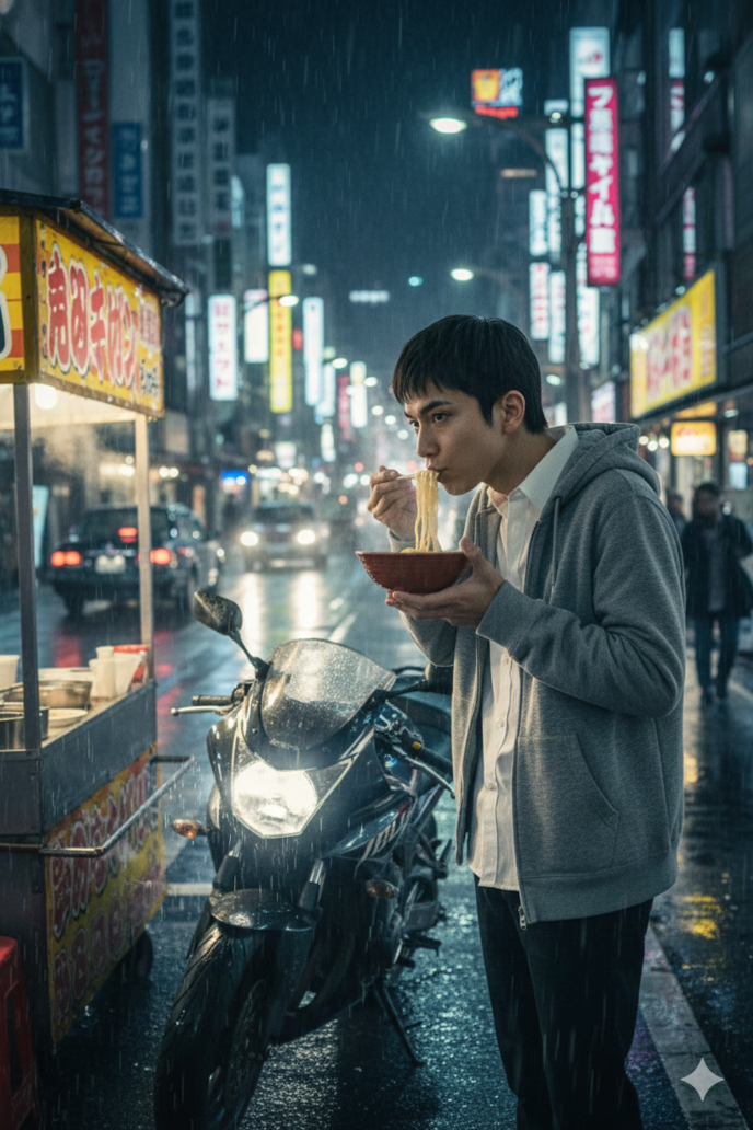 道端の屋台から美味そうな出汁の香りが漂ってくる。テイクアウトなんて論外だ。俺はその場で、熱々のうどんを啜り込んだ。
