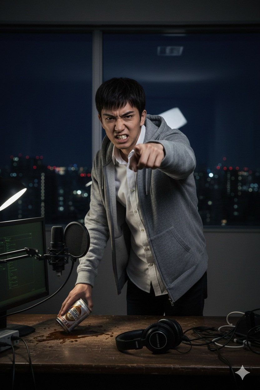 俺は手に持っていた缶コーヒーを、デスクに叩きつけた。ガツンという衝撃音がマイクを通じて配信に響き渡る。中身が少し跳ねたが、そんなことは知らねえ。俺の胸の奥で、マジキチな業火が音を立てて燃え上がった。