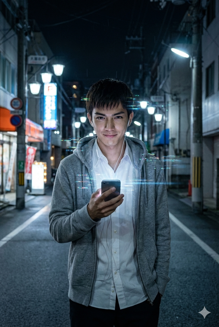 俺はいつものように、事務所から自宅までの8キロの道のりを、足の裏で確かめるように歩いている。額を伝う汗、肺を満たす少し湿った夜風、そしてポケットの中で微かに熱を帯びているスマートフォン。これらすべての感覚が、今夜は少し違って感じられる。