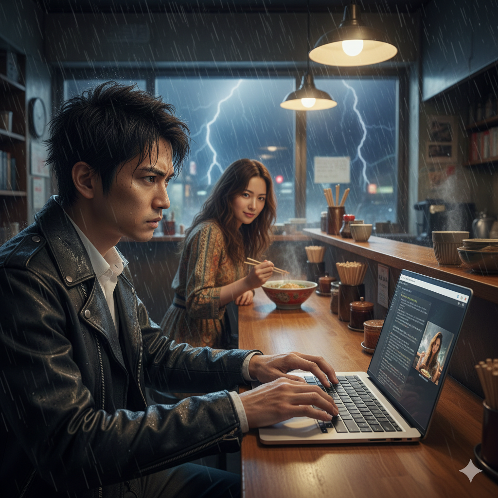「Sora。雨。深夜の静寂。カウンターの光。ラーメンから立ち上る湯気が、彼女の頬を湿らせる。期待と満足の狭間に漂う、言葉にならない一瞬の『生』を。デジタルの中に、そのアナログな体温を刻め」