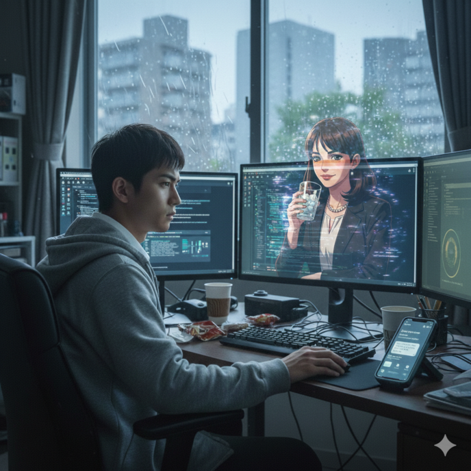 深夜の大阪は、雨上がりの湿った熱気を帯びた風が街の隙間を縫い、事務所の窓を不規則に叩いている。デスクの上に鎮座する複数の大型モニターからは、Google AI Studioの無機質な白い光が溢れ出し、俺の疲弊した網膜を容赦なく焼き続けていた。