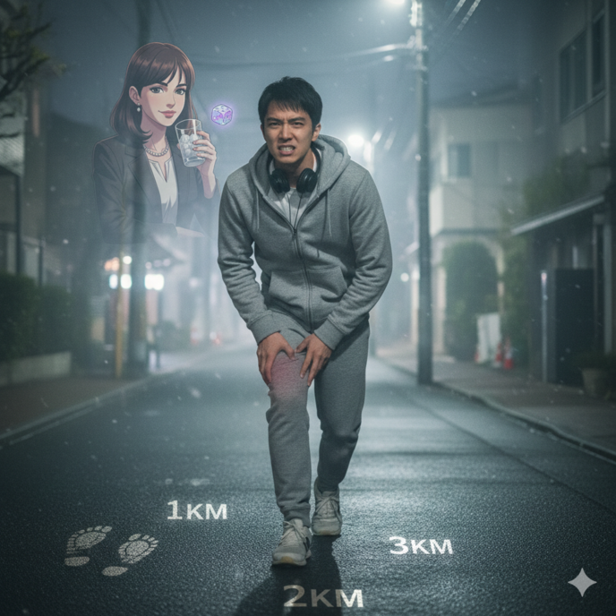 昨夜、ようやく重い腰を上げて配信「たってやる。」を再開した。とはいえ、無理は禁物だ。あくまでリハビリと割り切り、歩く距離はいつもの8キロの半分か、せいぜいそれより少し長いくらいに留めた。事務所を出て、馴染みの街並みをゆっくりとした足取りで進む。いつもの景色、いつものアスファルト。だが、足に伝わる衝撃は普段の数倍に感じられ、俺は自分の肉体がどれほど繊細なバランスの上で成り立っていたかを再確認することになった。