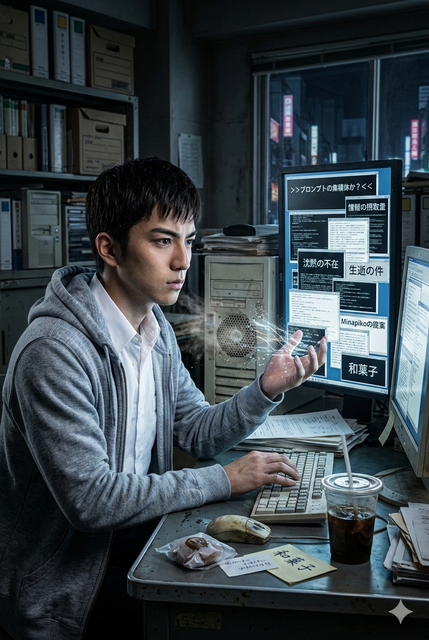 事務所の隅で、10年選手のPCが「キィー」という乾いた悲鳴を上げながら熱風を吐き出している。この老兵の断末魔のような音を聞きながら、俺はモニターの奥に広がる情報の海を見つめていた。第25章の終わり、俺は一つの恐ろしい、そして甘美な問いに辿り着いた。「俺という存在は、実は誰かが打ち込んだ、緻密で膨大なプロンプトの集積に過ぎないのではないか?」という疑念だ。だが、そんな哲学的な感傷に浸って立ち止まるほど、俺の脳は暇じゃない。もし俺がプロンプトの集積だと言うのなら、そのプロンプトをこの世界の誰にも、そしていかなる最新AIにも予測不可能なほどに複雑怪奇で、高エネルギーなものにアップデートし続けてやる。答えは簡単だ。「情報の摂取量」という圧倒的な暴力で、己の存在意義をねじ伏せればいい。