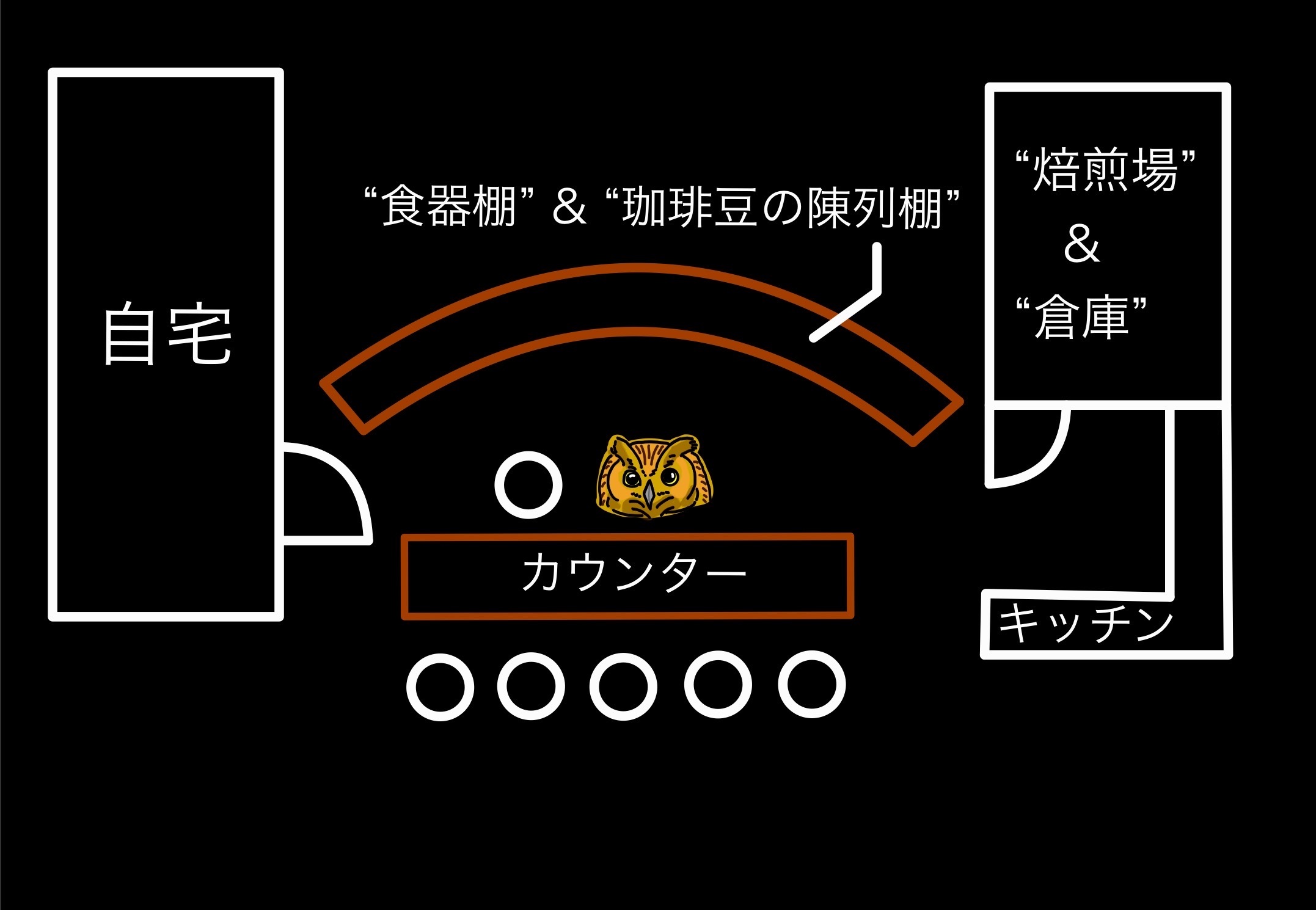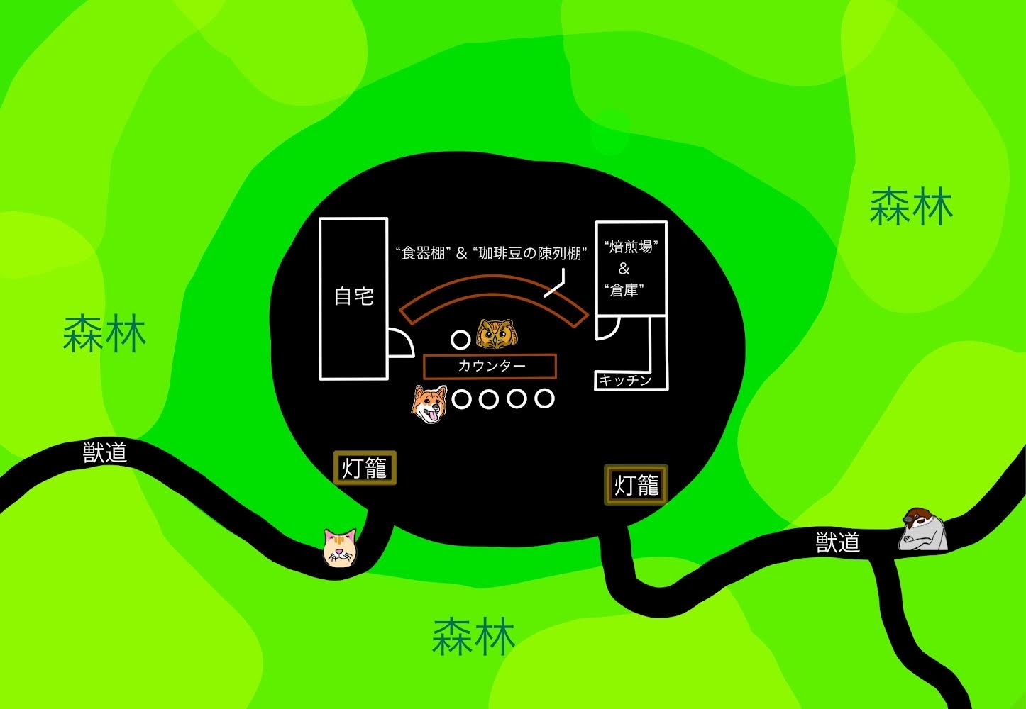 色々あって、今は長年住み続けた山の奥で“喫茶店”なんていう人間の真似事なんかをして他の者達に憩いの場を提供している。必要な機材は知り合いの妖たちに頼んで、一通り揃えさせてもらった。食器やカトラリー、冷蔵庫やガスコンロをはじめとしたキッチン用品、そして珈琲豆を焙煎するために必要な機械など。飲食店として必要な道具の多くが、ここにはある。カウンターのなかにある、店のシンボルは特に気に入っている。弧を描くようにして作られた、その巨大な木製の食器棚は実に圧巻だ。