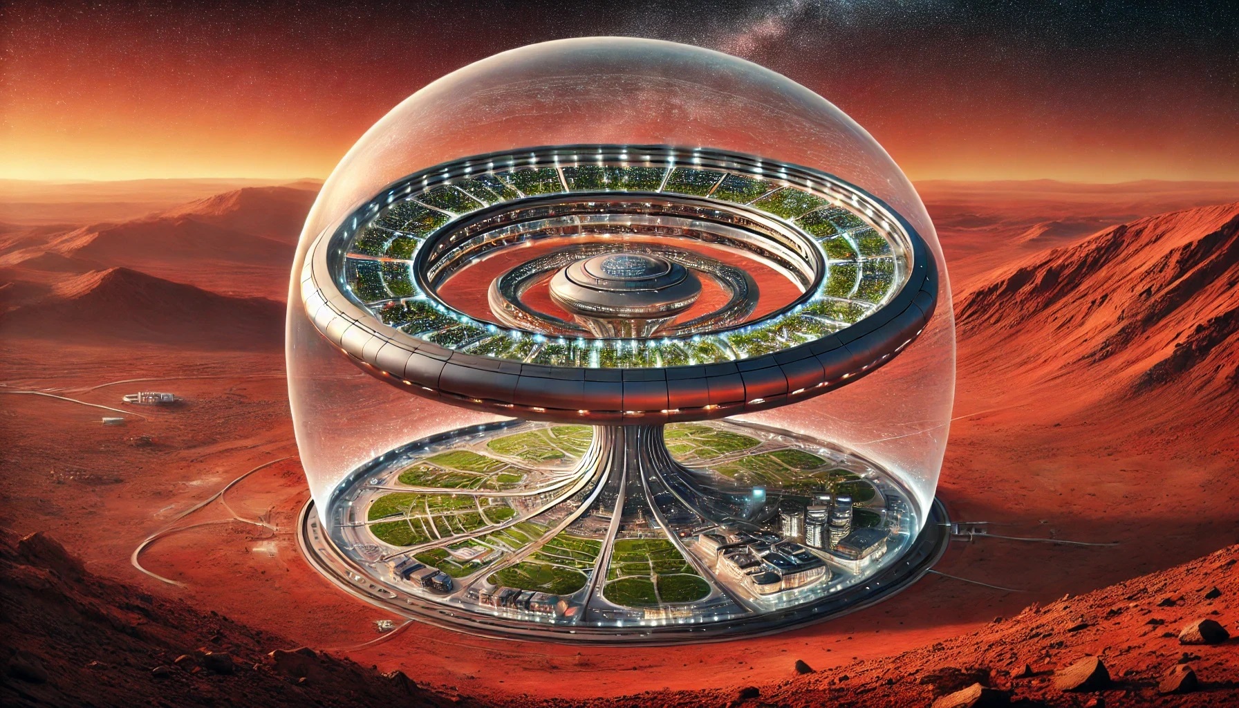 でも火星の住人たちは、太陽や地球から遠く離れて心細く感じないよう、火星ワールド自体が光り輝くための、いろいろな楽しみや催しを作り出しています。例えば、地球の重力の38%しかない火星の重力を逆手に取って競技場の中を飛び回るスポーツやダンスやアクロバットは遠く高く跳べるのでスリリングです。これにAR(拡張現実)を組み合わせると非常にエキサイティングになります。宇宙服を着て二輪や四輪のビークル(乗り物)に乗って、いろいろな地形を走ったり跳んだりする遊びや競技もあります。また希薄な大気でよく見える夜空の星の観測や星空を祝うお祭りもあります。先端技術を使った光の彫刻、迷子になりそうな大きな植物園や水泳用のプールもあります。生活を楽しむために熱心に工夫するのが、火星住人の特徴なのです。