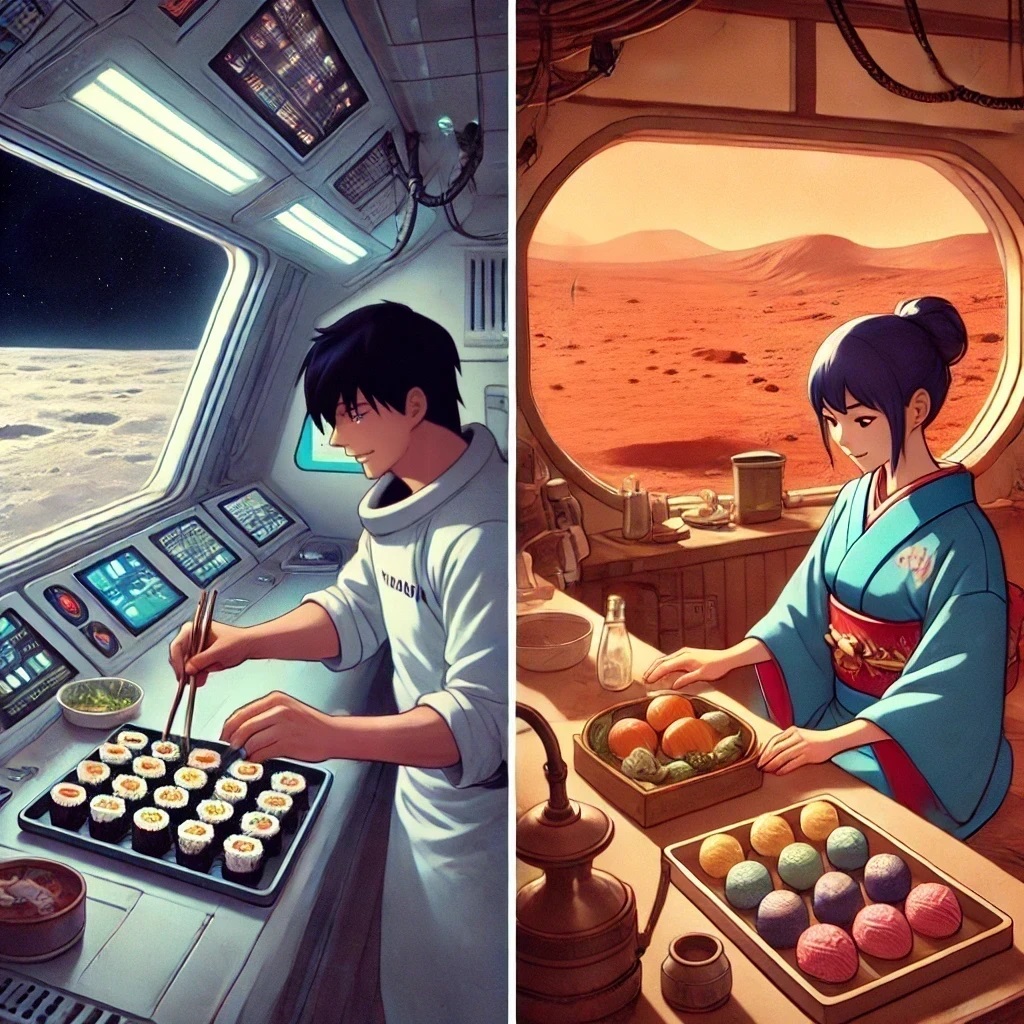 そしていつもの生活が始まりましたが、二人の心には新たな希望が芽生えていました。月と火星、遠く離れた場所に住む彼らが再び会える日を夢見て、毎日を大切に生きていくことを誓いました。二人は、地球で味わったお鮨と和菓子を再現するために、材料の調達方法に挑戦し、作り方に工夫を重ねて、それぞれの世界の食文化を豊かにしていきました。