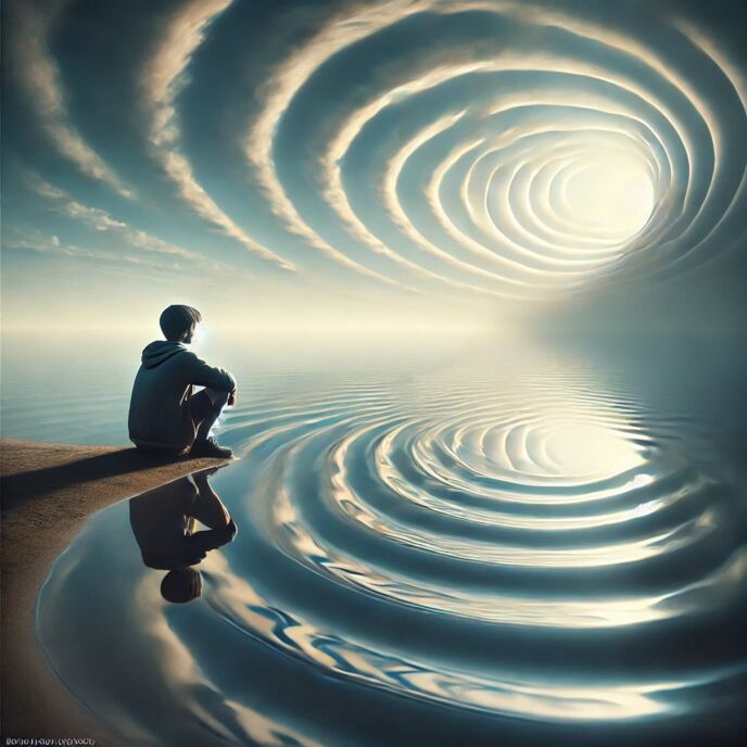 ある少年がドリフト湖の端に立っています。彼が見ている水面のさざ波が、「現実」なのか「心の反映」なのか、彼には分かりません。その水に足を踏み入れれば、自分が溶けてしまうのではないかと、彼は恐れます。だから彼は座り、空が水に映るのを、ただ見つめます。そして彼は気づきます。違いなど、最初からなかったのだと。