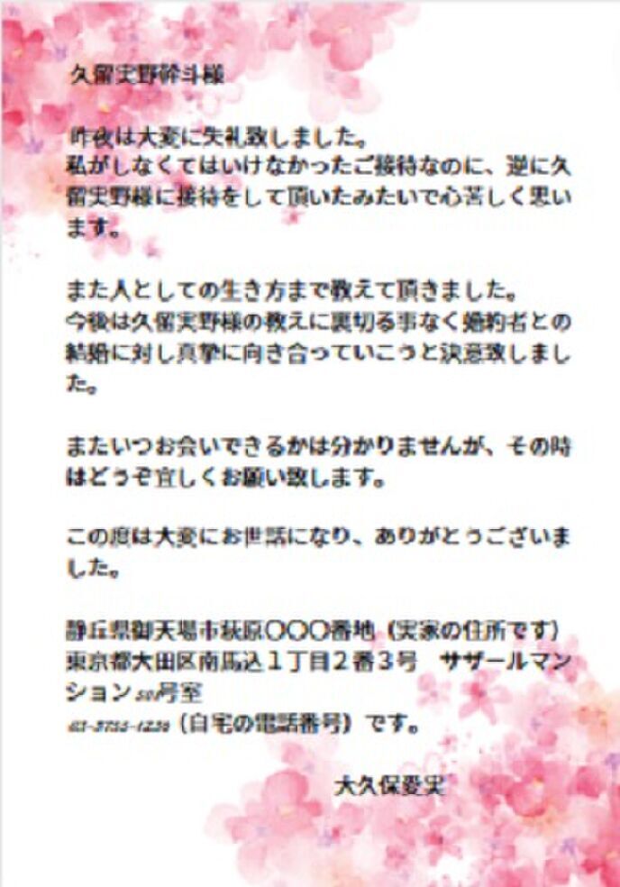 「久留実野幹斗様 お陰様で本日、式を滞りなくあげる事が出来ました。ありがとうございました。(中略)お料理の全てが美味しくて感動しました。久留実野様のご厚情にお応えすべく、主人と二人で幸せな家庭を築いていく所存です。(後略)」だった。