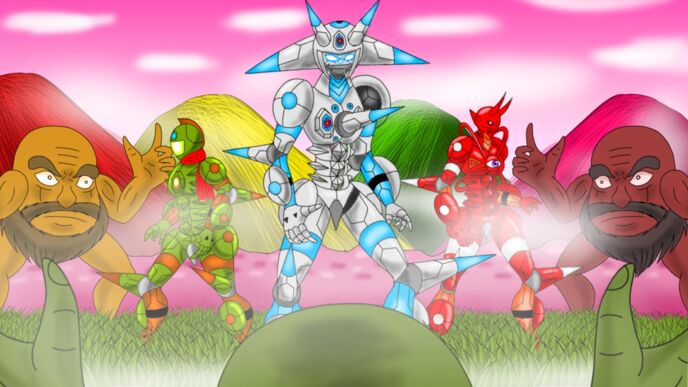 アミーダ3機の連携攻撃で抵抗出来なくなったさんだるま。そして、3機はさんだるまに向け、合体交戦を放った。
