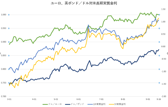 井坂の話通り、作成したグラフは赤い太線で示したドル円レートが、黄色の5年もの米国実質金利に沿うかたちで右肩上がりにジグザクしながら上っていく。上へ行くほど1ドルで買える円の量が増えるという意味だから、「円が安くなる」訳だ。グラフの中央からやや右にずれた辺りで赤い太線が黄色から上方向へ乖離するが、これは「サマーラリー」と呼ばれるアメリカの株高の期間に相当し、9月初旬まで続く。それでもトレンド的にはこの期間でさえ実質金利に追従していることが見て取れる。