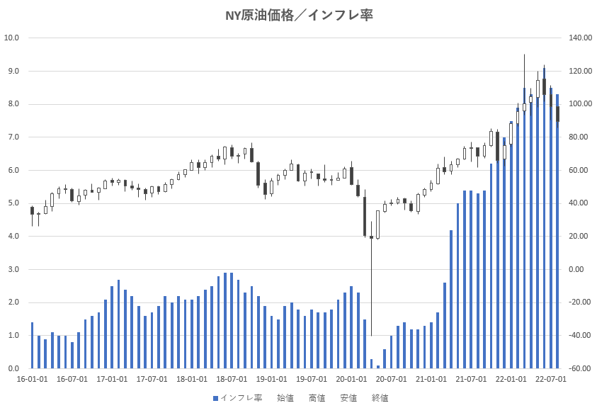 「上にニューヨークの原油先物価格の推移、下の棒グラフには日本とアメリカのインフレ率を表示しました。日本のインフレは確かに原油との相関性が高いと言えますが、問題はアメリカです」