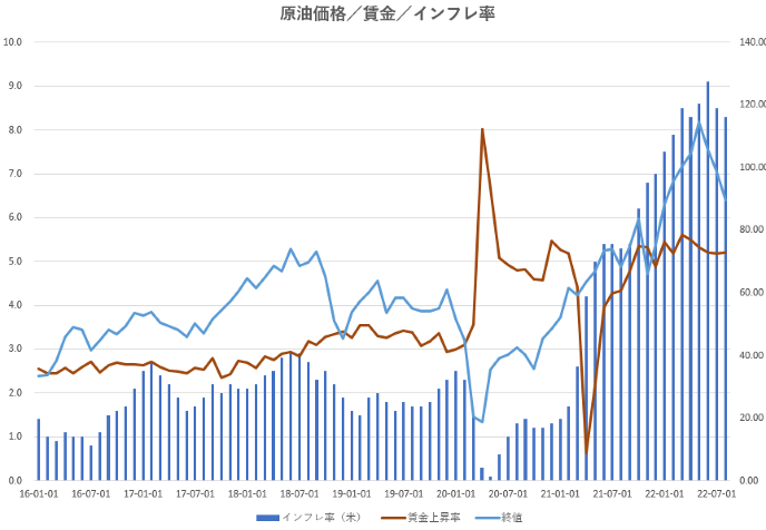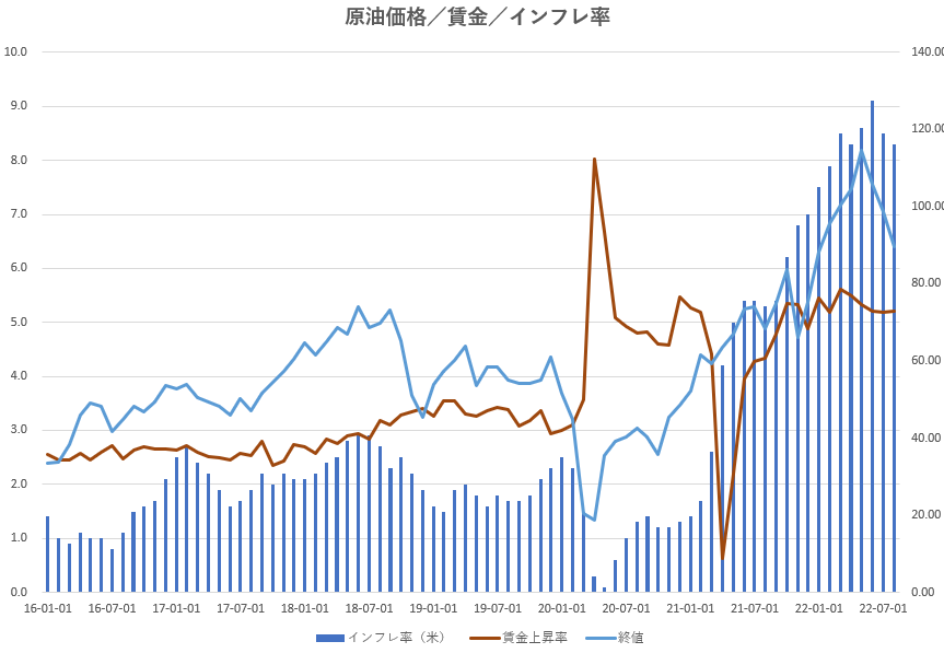 吉川がつくった原油価格とインフレの図表に賃金上昇率の推移を重ねてみた。ローソク足に折れ線グラフは合成できないから、原油は終値をつなぐ折れ線で表示した。
