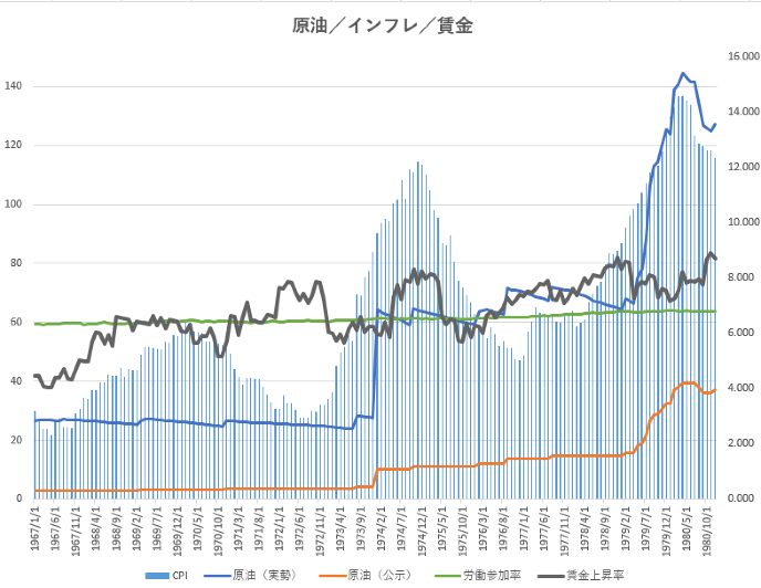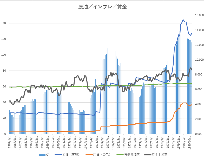 一方、グラフ左端の賃金の上昇とインフレ率の動向は見事に連動し、第二次オイルショック前のインフレ局面でも賃金が先導している様が見て取れる。いったん火が着いたインフレの炎に、文字通り“油を差した”のが原油高だったとするならば、その通りなのだろう。