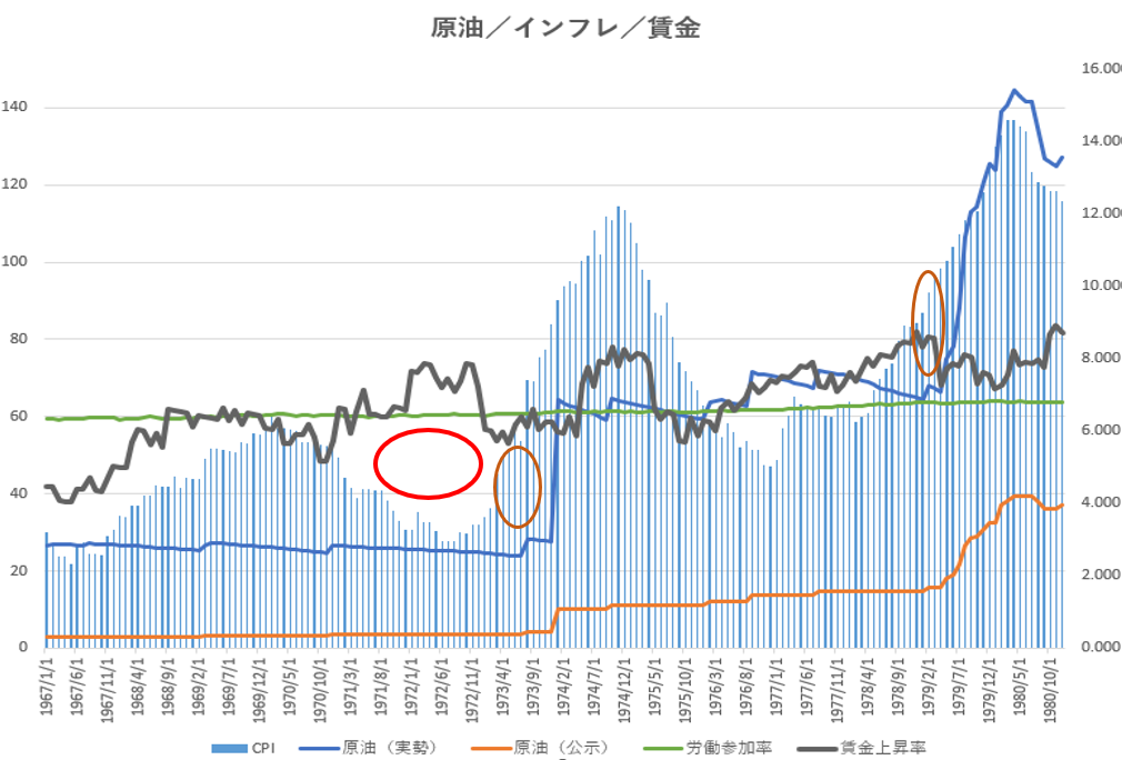「ところで今日はこんなの作って来たんだ。1970年代のインフレと原油価格の推移と、賃金上昇率の動静を重ねたものなんだけど……」
