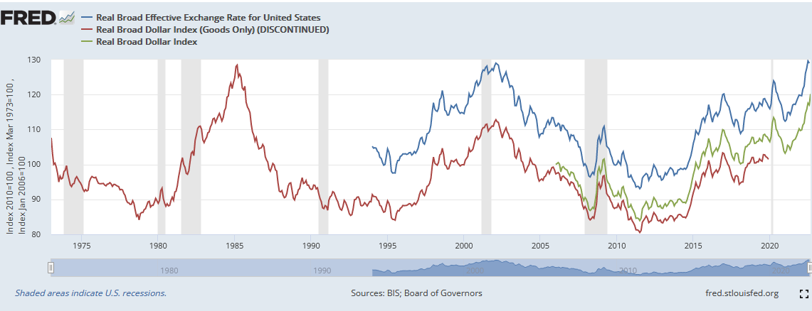 ここに掲げたのはセントルイス連邦銀行が公表している「実質実効ドル指数」のグラフである。日々取り引きされる為替レートとは別に、物価や貿易量などを加味した通貨の“実力”を示したものだ。同じ指数を「国際決済銀行(BIS)」も公表していて、どちらを選ぶかによって見える世界は異なってくる。