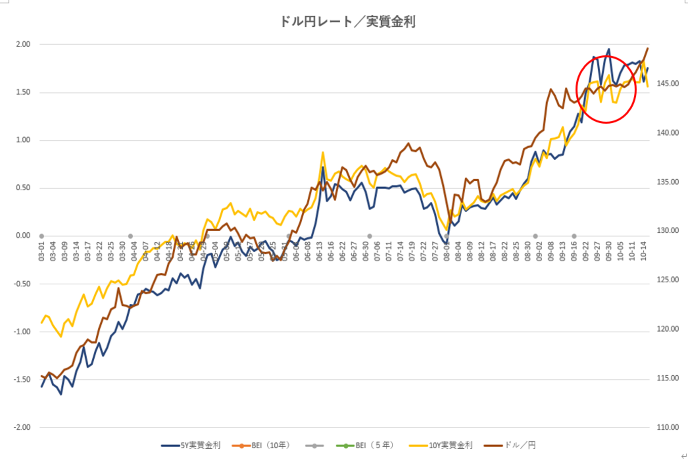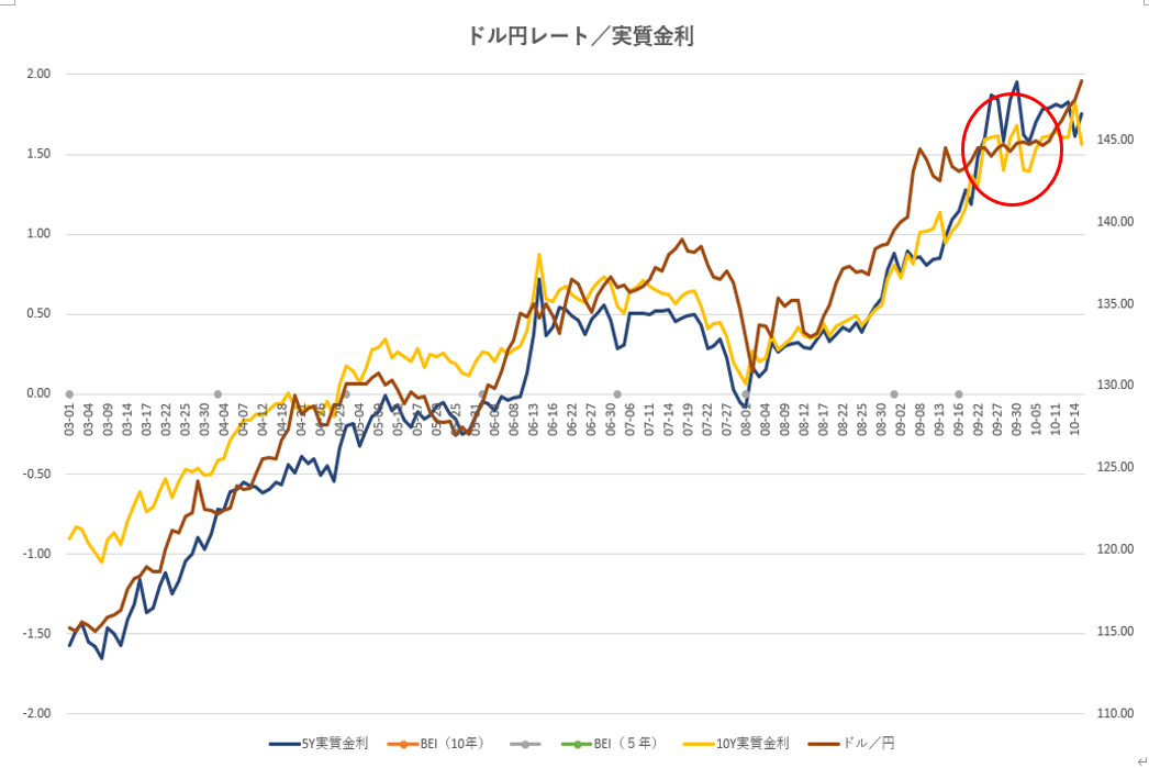 しかし、上図の赤い丸で示した通り、5年もの実質金利が大きく上下にスイングした9月下旬から10月初旬の12営業日間、ドル円レートは144円台に張り付いた。これを「無駄玉」と呼ぶのは何を引き合いにしてのことなのだろうか? およそ介入には賞味期限がある。短くて2~3日、長くても2~3週間が普通だという。その意味で今回の介入の評価は“まあまあ”が至当だと思うがいかがだろう?