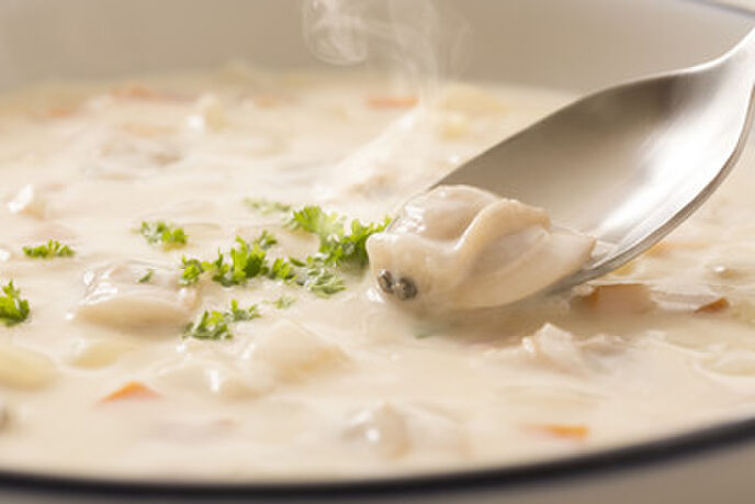 ほのかな塩胡椒の味とジャガイモが適度に溶けた「とろ~り」と「しっとり」「ほくほく」感。それに何といっても小さく切った貝の風味と独特の食感が、他のスープには真似のできないクラムチャウダーの魅力だねぇ~。