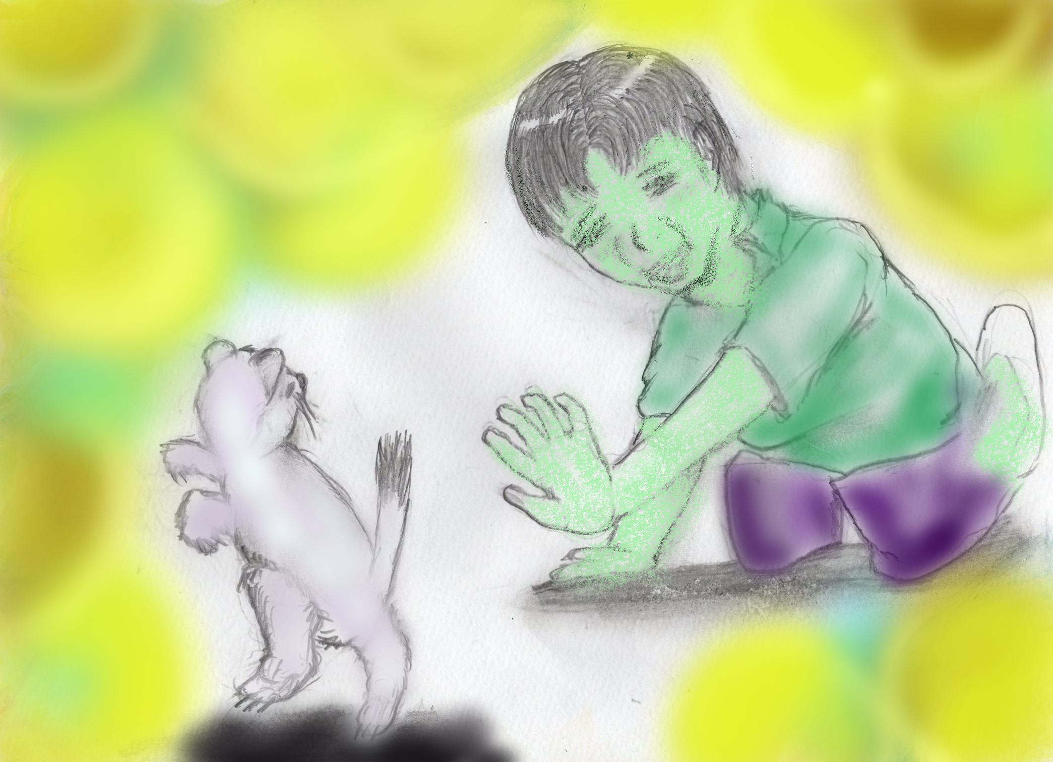 オコジョの坊やは必死に逃げ回るけれど、オニの子供が笑顔で追いかけてくるので、少しだけ、楽しくなっていました。