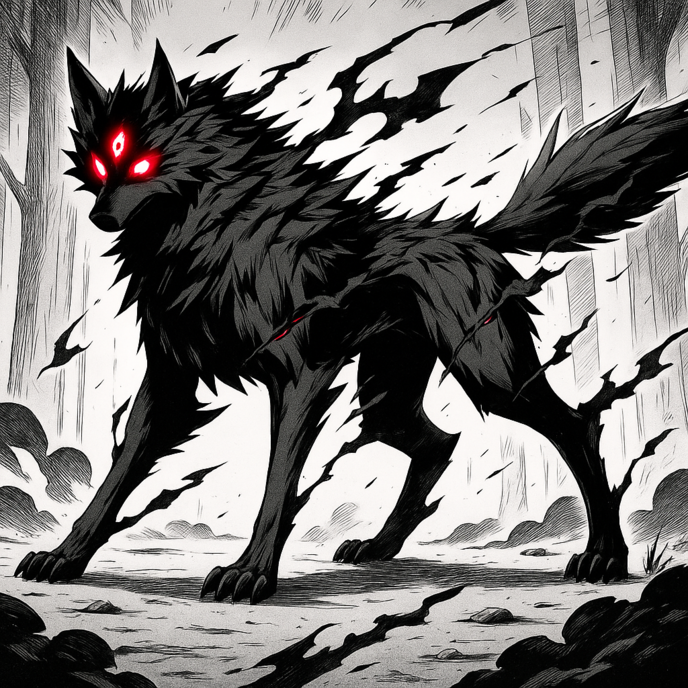 牙は血で濡れ、赤い光を帯びた眼差しが鋭く突き刺さる。