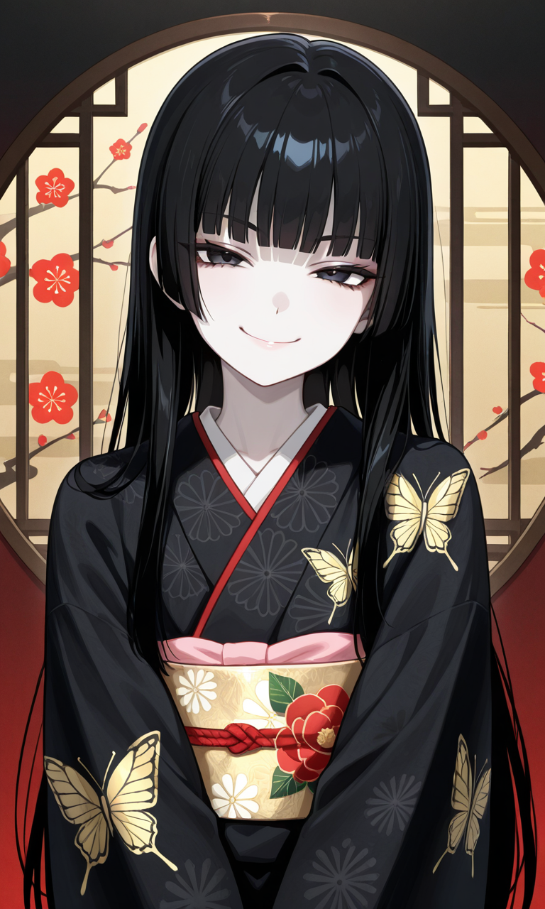 小袖も黒いが、蝶や花が鮮やかに染められており映えている。