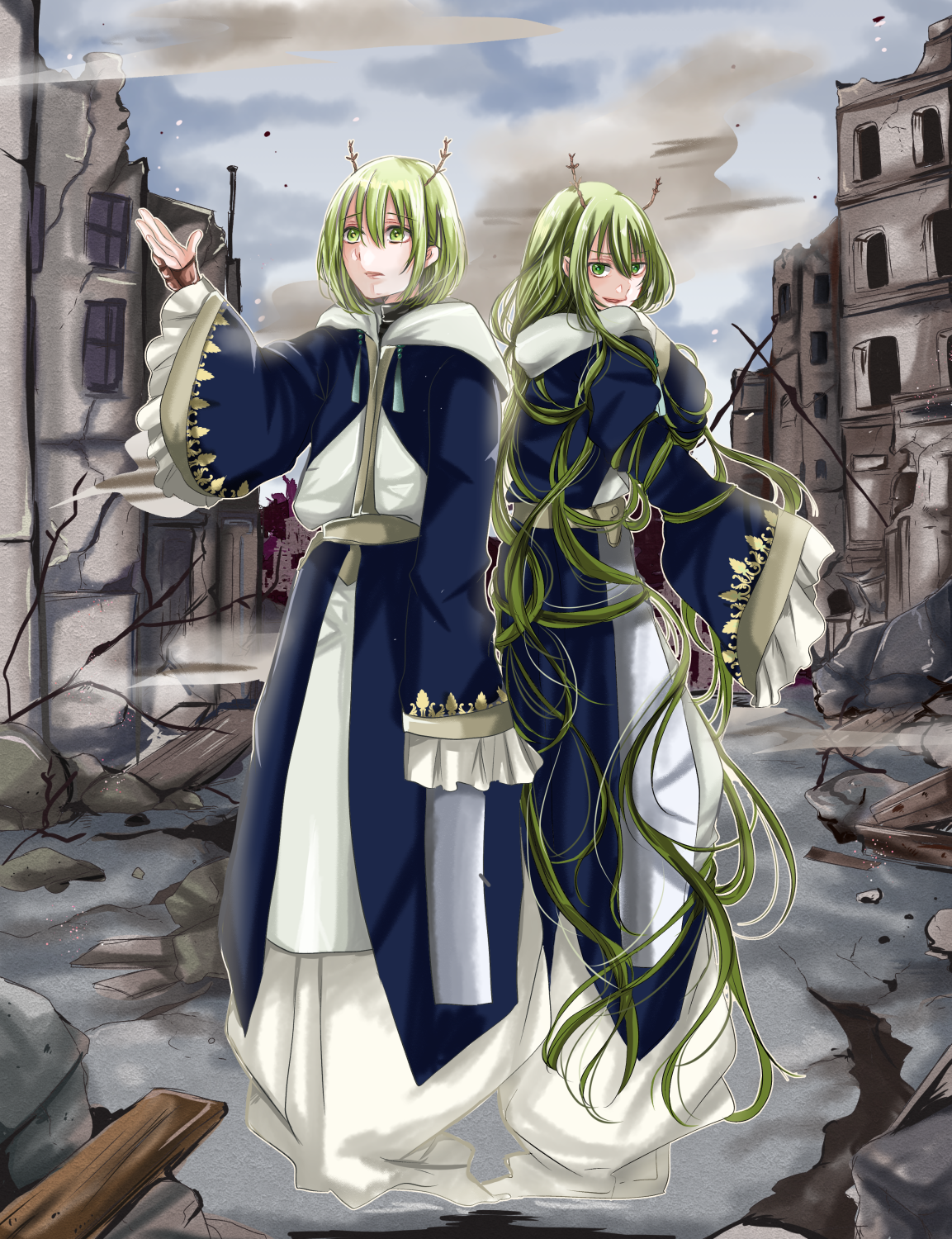 クーアさんの髪が風もないのにざわめき、見る見るうちに伸びて血でドス黒く染まったローブに絡まっていく。色も鮮やかなライトグリーンからダークグリーンへと変わり、さながら古城に絡みつく蔦のようだ。