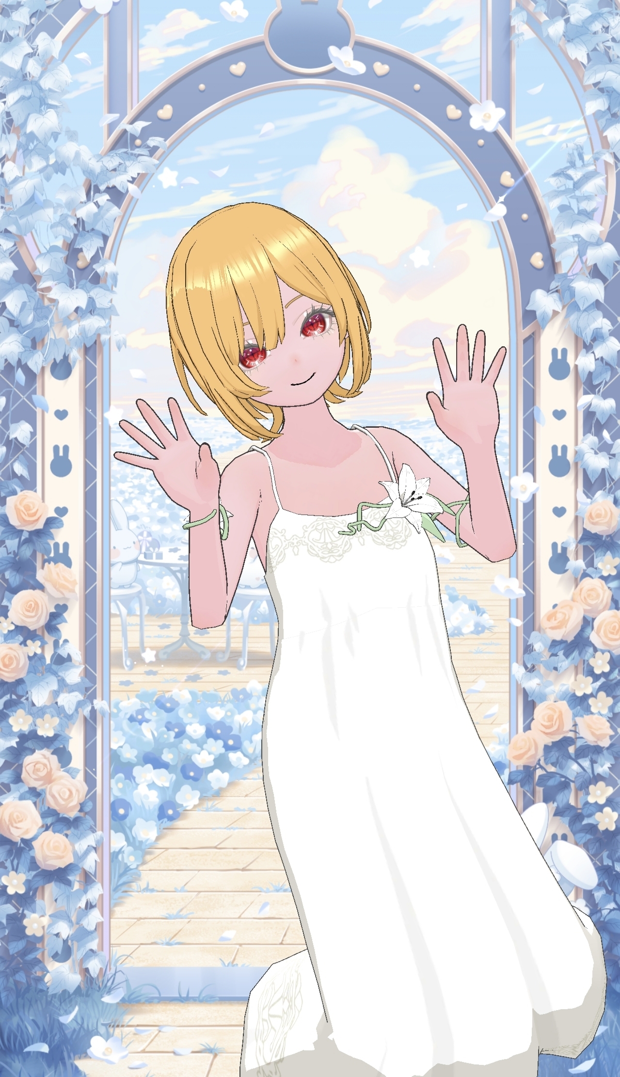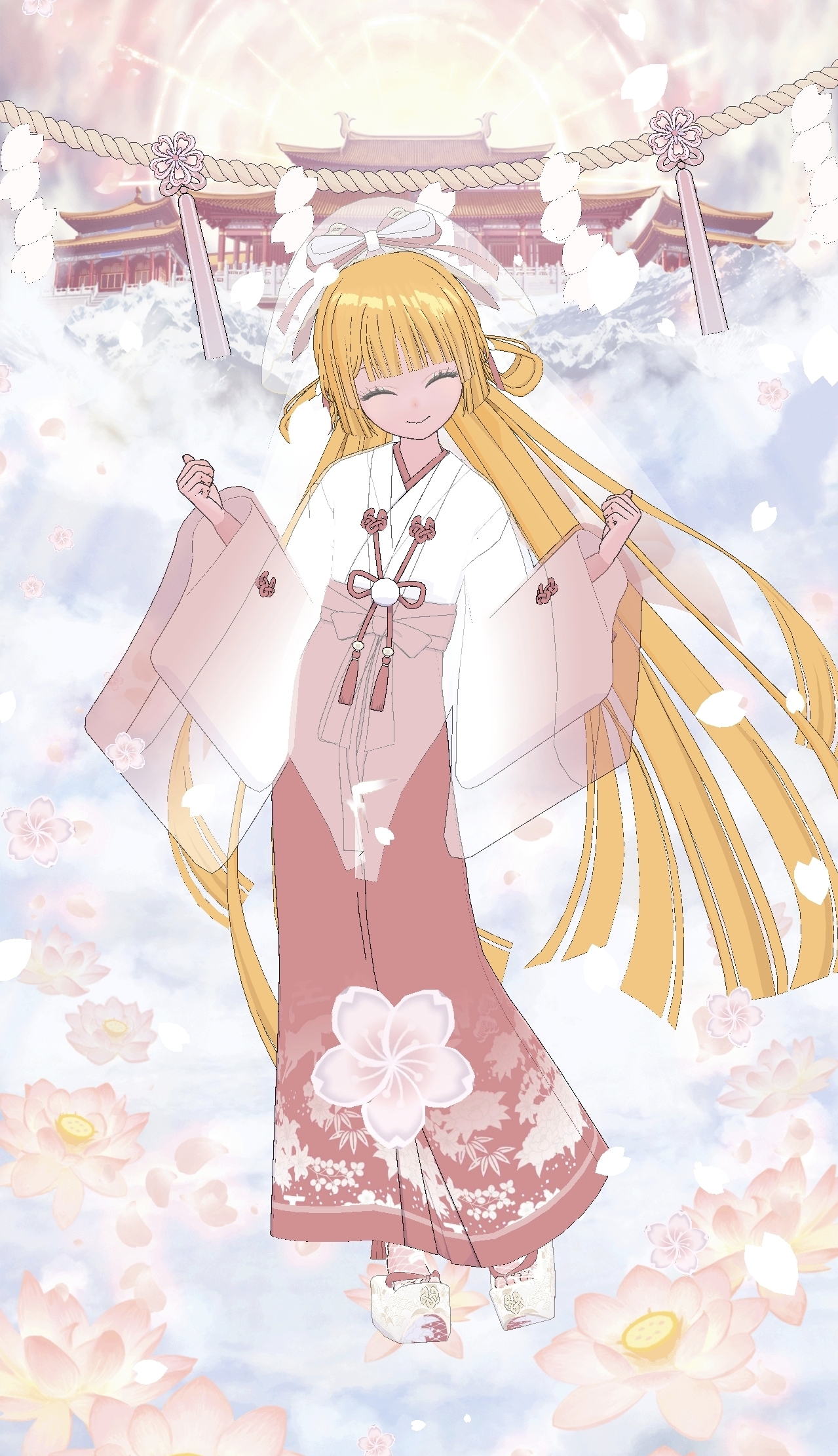 花咲く大殿にて、天媛は女神の如く艶姿。