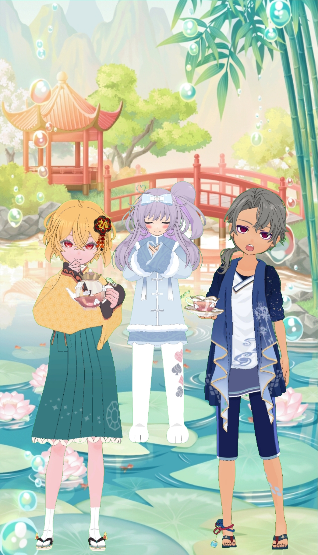 お庭の東屋にて、天媛・長上、互いに笑みを交わす。