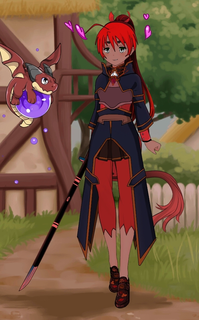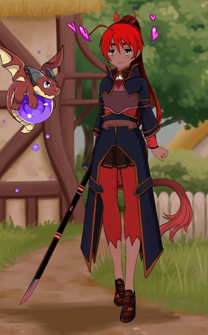 人の形に化けているが実は赤色のドラゴンで、ドラゴンの姿だと体長4メートルくらいだ。人間に化けている時は、ミラよりも少し低くなっている、168cmと言ったところだろうか、やせ形で、か弱そう、手足は細く目鼻立ちは整っていて、中性的な印象を受ける。人間の姿では肌は健康的な小麦色、とてもキメの整った肌で太陽の光に当たるとテカりがあって綺麗だ。身長は好きに変えられるらしいが、可愛く見えるようにと意識してミラより低くなっているそうだ。