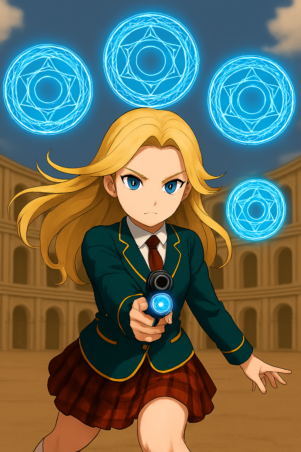 あそこに立っているのは、こちらの方に向けたままの銃口を中心に、円を描くような魔法陣が五つも発生して、中心の方の魔法陣を銃口から発生されるらしきそれ以外にも、旋回して回っている他の四つの魔法陣もオードリーの周囲の頭上、右側、左側と中心魔法陣のある銃口の下にまでぞの存在を主張するかのように、ピカピカと点滅しながら車輪のごとくぐるぐると回転をし始めている様子だからだ。