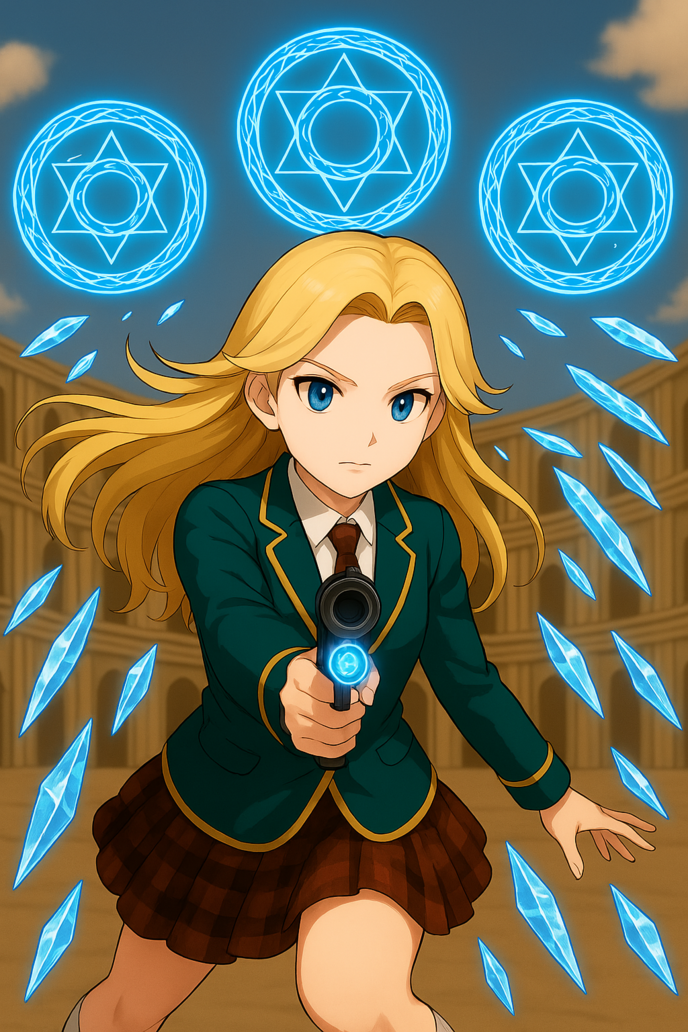 「いいえ、冗談じゃないわよこれは!何を隠そう、これはあたくしが8年間も鬼のような鍛錬を費やしてきて、昨年末でやっと習得した【第2階梯の精霊魔術】にして、ベネ特有の【災乱弾五円陣撃(ファイブサークルズ・オブ・カラミィーティシャース・ブーレット】の必殺技よ!」